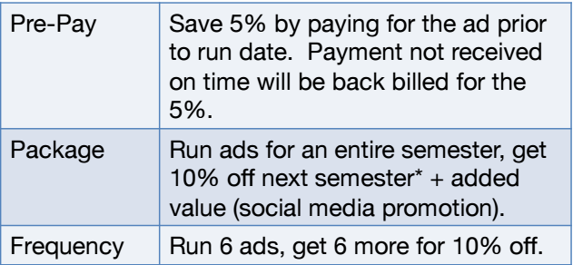 - Dimensions must be specified in inches or % of page format (i.e. 3”x 5” or 1/2 page).