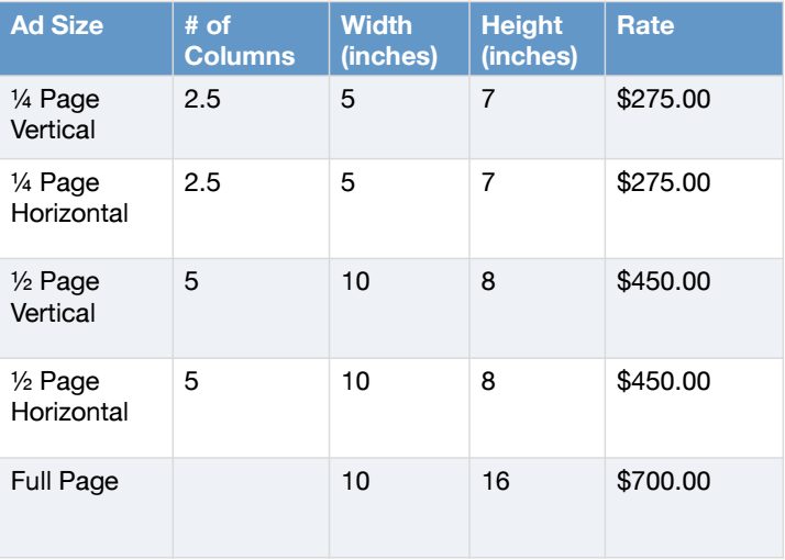 - Dimensions must be specified in inches or % of page format (i.e. 3”x 5” or 1/2 page).